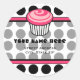 A sticker featuring an illustration of a hot pink cupcake with matching trim. Background is black polka dot. Look for matching items such as invitations in the "Birthday Shop" category of The Pink Schoolhouse store.