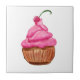traditional watercolor design of a tasty looking cupcake with lots of pink coloured cream and a little cherry as a topping on a ceramic tile.