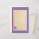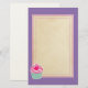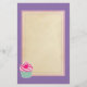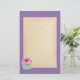 Graphic art / illustration of a yummy pink cupcake with swirls of icing on top and a cute, hot pink, polka dot cherry. The base is green and white stripes. This writing paper has a purple background with a central writing area in a parchment colour with a soft pink double border.