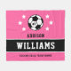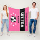 A fun soccer-themed fleece blanket featuring a soccer ball with player number, first and last name, star accents, and custom team name. The playful pink and black color block design is perfect for soccer players who love to stand out. All text and colors are fully customizable to match any team or club. A spirited gift for soccer fans of all ages.