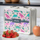 Personalise this cute dinosaur themed lunchbox with your child’s name in white lettering for a cool custom touch! Created especially for dino-loving kids, this colourful design features pink, purple, and mint green dinosaur illustrations on a blush pink background.