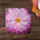 Ceramic tile that features the photo image of a big, pink Dahlia bloom with yellow centre. A lovely, floral design! Select your tile size. Makes a pretty kitchen trivet!