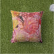 Here is a beautiful decorative outdoor pillow featuring a collection of waterlily dahlia blossoms in a colourful pastel abstract pattern of pink, orange and yellow. The image is repeated on the back.