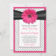 Black and white pinstripe, pink gerbera daisy flower and ribbon wedding invitation. Pretty hot pink, black and white daisy and pinstripe wedding invitation is perfect for a spring or summer bold and cheerful wedding! Hot pink gerbera daisy flower paired with a simulated black ribbon and black and white retro pinstripe pattern background. If you like hot pink daisy flowers, this is perfect for you.