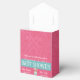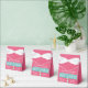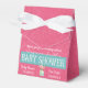 These elegant Pink Damask favour boxes are perfect for any baby shower! A shimmery bright pink damask background with a blue ribbon that says "baby shower".