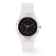 I only have one complaint. I ordered the watch with clear case and strap, and what was sent was white case and strap. I'm going to keep it because 1) it looks very nice in white, and 2) it would take too long to get a replacement made and sent in time for my occasion. Aside from the mix up with the color, the watch does look very good in white. The purple dial is actually sparkly which did not show in the online images. That was a nice surprise. If you like Swatch watches this is very similar to those. It's 33.6mm in diameter, 10.5mm thick, and 40.6mm lug to lug. Stainless steel case back says 3ATM/30m WR, so no swimming or showering or submerging this one. If you like Woodstock, this is a great choice.