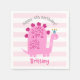 A fun, whimsical, playful visual of a cute, bold, kawaii, pink brontosaurus, and fun, handwritten typography over a light pink and white striped background, honours the birthday child. Add love and joy to your party whenever you use this simple, modern, and whimsical, personalised paper napkin. Your choice of 3 sizes: cocktail, luncheon or dinner. This charming paper napkin is guaranteed to set just the right tone for your event! Matching invites, stickers, plates, and other birthday goodies are also available in this special and fun collection.