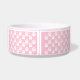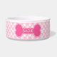Pink dog bone silhouette with a personalizable text area for pet's name or other custom text such as "food" or "water", for example. The background colour is light pink with a pattern of white dog paw prints. Make your pet's dining area chic while adding a pop of pink colour to your space.