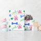 Are you looking for a way to make a gift for a dog lover special? This wrapping paper features a pattern of pink dog paws, blue dog bones, green hearts and woof text.