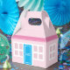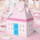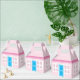 A custom party favour box with the event name and thank you message. House design for pink doll theme birthday inspired by the Margot Robbie Movie.