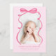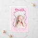 Whimsical and sweet birth announcement card featuring hand drawn photo frame of pink line with a bow at the top.