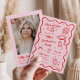 A quirky graduation invitation that features a wavy frame, doodle graphics, an on trend red and pink colour palette and a hand written font. This fun invitation is easy to edit and is perfect for a girl's graduation party. Pair with anything from the TILLY collection for a cohesive look.