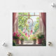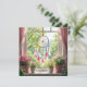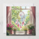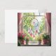 Keep in touch with a friend or family member with this gorgeous card with an ai illustration of a beautiful pink feathered dreamcatcher hanging in the window with a shelf of pink and white potted flowers under it, overlooking a yard full of Lucius green trees.