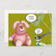 A Pink Easter Bunny talking to a pheasant standing on a rock. with a grass green background.with happy easter in black text.