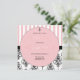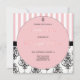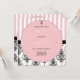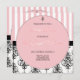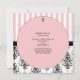 This beautiful elegant baby shower invitation will make any mother to be feel special! Large centre cirlce frame in tiny black dots, accented with a vinatge damask element for you to personalise with all of the information for your party or shower. The top half has a background of white and pink stripes and the bottom has an elegant black and white damask. Full colour print front and back. Suitable for ladies or girls birthday, bridal or wedding shower or baby shower simply change the invite text for your event.