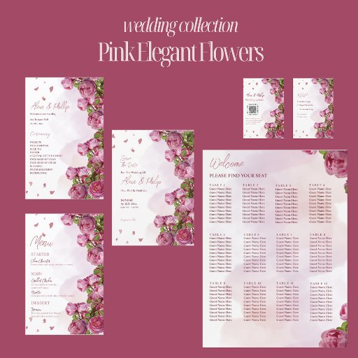 This Pink Elegant Flowers Wedding Menu card radiates elegance with its soft pink tones and luxurious peony floral design. The card features a delicate arrangement of pink peonies cascading along the right side, creating a romantic and sophisticated look. The background is a subtle pastel blush, enhancing the beauty of the floral details. The typography is a graceful script font, adding a touch of elegance, while the main details are highlighted in an understated serif font for clarity. This invitation is perfect for a spring or garden-themed wedding, setting a refined yet inviting tone for your special day.