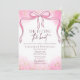 "She is tying the knot" blush pink coquette bow bridal shower design with watercolor stains and gold glitter elements.