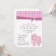 Cute baby shower invitation, done in a pink and white polka dot and plaid patterns, with a pretty pink ribbon, across the top. Sweet graphics of a pink plaid elephant, decorates the bottom right side. Personalise the text to suit your shower party needs. Adorable invitation.