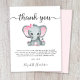 Cute baby girl shower or sprinkle thank you card with "thank you" in a stylish soft grey script with swashes and a pink watercolor of baby elephant. Underneath you can easily personalise your thank you message in simple grey topography or leave blank for a handwritten note.