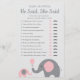 Use our pink and grey elephant themed He Said She Said game to let the shower guests guess who said each of the phrases on the quiz - the mummy, the daddy, neither or both.