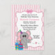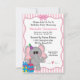 Pink Elephant Birthday Party Invitation for Kids. This birthday invite features a cute elephant wearing a party hat. The background is pink stripe with a pink bow and pink heart.©KristiW