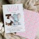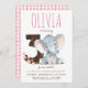 This invite features a pink elephant for a third birthday party. Back of invite has a pink gingham pattern. Personalise the invite with your details and you have the options to purchase printed invitations or a digital download.