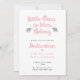 A cute typographical invitation for the dedication of your little girl featuring a line from the popular hymn Jesus Loves Me. The phrase"Little ones to Him belong" is written in baby pink brush lettering font, flanked by two grey elephants.
