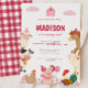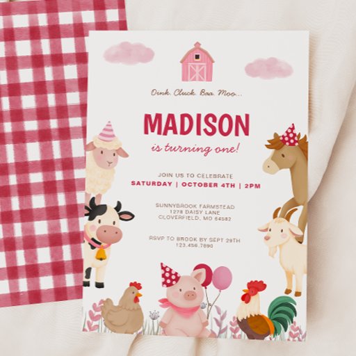 Oink, cluck, baa, moo—your little one is turning one, too! This sweet farm animal birthday invitation features a pink barn, gingham accents, and a joyful barnyard crew in party hats, perfect for a girl’s first birthday or toddler farm-themed celebration. Customise with your child's name, party date, and RSVP info to create a charming invite for a day down on the farm!