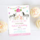 This adorable invitation features farm animals with balloons and faux gold foil confetti.