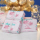 This custom gift wrapping paper features a retro style pink flamingo theme. The image features a flamingo standing beneath a pair of palm trees on a tropical island. The image has a glamourous pink foil pattern with glitter accents. A sample "Happy Birthday" greeting is printed in a pretty bubblegum pink colour, with a personalised name printed in a vintage teal font.
