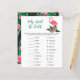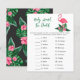 Baby shower invitation design features pink flamingo with lush green palm leaf fronds and tropical hibiscus flowers. "Aloha Baby". A tropical floral pattern with black background colour dresses up the back of the card.