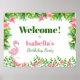 This cute pink flamingo girl's birthday party welcome sign offers a watercolor graphic border of lush tropical leaves and pink flowers and is accented with an adorable pink flamingo. Personalize this welcome poster with the birthday girl's name.