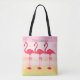 Create a custom pink flamingo tote bag add your own name or text to personalise it on shabby chic stripes in shades of pink and yellow all over print.