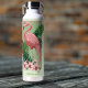 A pink flamingo with green tropical leaves and pink lilies in a backdrop of light green