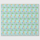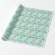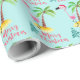 festive wrapping paper with a tropical island theme. A cute illustration of a pink flamingo in a red santa hat. Standing beside a green palm tree on a mound of yellow sand. A fancy swirly christmas tree design is placed beside the text Merry Christmas. Written in the colour pink in a fancy handwritten font. Pastel green background.