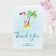 Christmas thank you greeting card. Drawn with a cute illustration of a pink flamingo wearing a red santa hat. Standing on a mound of sand with a tropical palm tree behind. Personalise your message inside. Set on a light blue background.
