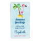 Christmas kitchen label, personalised with a name. Text says from the kitchen of , and made with love. A whimsical drawing of a pink flamingo wearing a red santa hat. Standing on a mound of yellow beach sand with a green and brown coconut palm tree in the back. Light blue background with a faint polygonal pattern. Cute and fun festive tropical design.