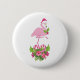 A button with a tropical themed Christmas flamingo wearing a pink santa hat. Underneath its feet is a candy cane bouquet with pretty tropical flowers and pink berries. A sprig of holly on its chest.