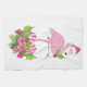 A kitchen towel with a tropical themed Christmas flamingo wearing a pink santa hat. Underneath its feet is a candy cane bouquet with pretty tropical flowers and pink berries. A sprig of holly on its chest.