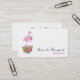 Business cards with a tropical themed Christmas flamingo wearing a pink santa hat. Underneath its feet is a candy cane bouquet with pretty tropical flowers and pink berries. A sprig of holly on its chest.