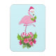 Magnet with a tropical themed Christmas flamingo wearing a pink santa hat. Underneath its feet is a candy cane bouquet with pretty tropical flowers and pink berries. A sprig of holly on its chest.