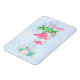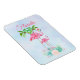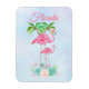 Flexible travel magnet. Text says Florida. Designed with an illustration of a momma and baby pink flamingo standing on a bed of floral succulent flowers with green palm trees swaying in the back. Tropical and pretty. The background is a summery light blue watercolor with hints of purple.