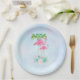 Paper plates with an illustration of a momma and baby pink flamingo standing on a bed of floral succulent flowers with green palm trees swaying in the back. Tropical and pretty. The background is light blue.