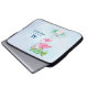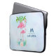 A laptop sleeve personalise with a name and initial. Designed with an illustration of a momma and baby pink flamingo standing on a bed of floral succulent flowers with green palm trees swaying in the back. Tropical and pretty. The background is a summery light blue watercolor with hints of purple.