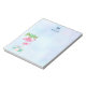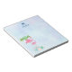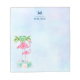 Notepad customised with a name and initial. Designed with an illustration of a momma and baby pink flamingo standing on a bed of floral succulent flowers with green palm trees swaying in the back. Tropical and pretty. The background is a summery light blue watercolor with hints of purple.