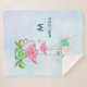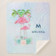 Personalised sherpa blanket with a name and initial. Designed with an illustration of a momma and baby pink flamingo standing on a bed of floral succulent flowers with green palm trees swaying in the back. Tropical and pretty. The background is a summery light blue watercolor with hints of purple.