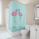 A couple of pink flamingos wade in the water on this aqua blue shower curtain. Personalise the names and monogram below with your own. Blue background colour may be changed by customising.