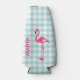 Cute aqua gingham bottle cooler done, with graphics of a cartoon pink flamingo. Personalise the pink text to suit your needs.