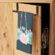 A kitchen towel with an illustration of a pink flamingo standing on a bed of floral succulent flowers with green palm trees swaying in the back. Tropical and pretty. The background is dark blue.