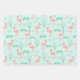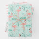 Pink flamingo images are the feature on two of the sheets in this trio of all occasion wrapping paper sheets. Along with the flamingos are teal leaves and lily pads. One paper has a light teal background, and one has a light pink background. The third paper has matching pink and white stripes. Pretty for any occasion!
